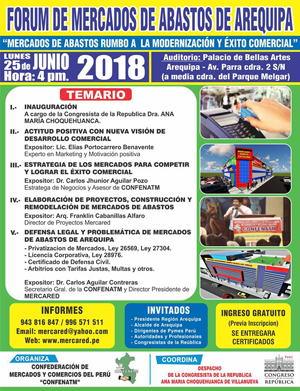 EDGAR ESQUIVEL SUCASACA, fué elegido Presidente del FRENTE DE DEFENSA Y MODERNIZACION DE LOS MERCADOS Y COMERCIO DE AREQUIPA, la Elección se realizó el 25 de junio en el Forum de Arequipa Y LOS 1O DIRECTIVOS FUERON JURAMENTADOS POR EL Dr. CARLOS AGUILAR CONTRERAS sec. general de la Confederación de Mercados y Comercio del Perú "CONFENATM"